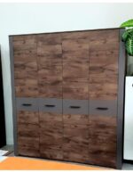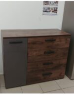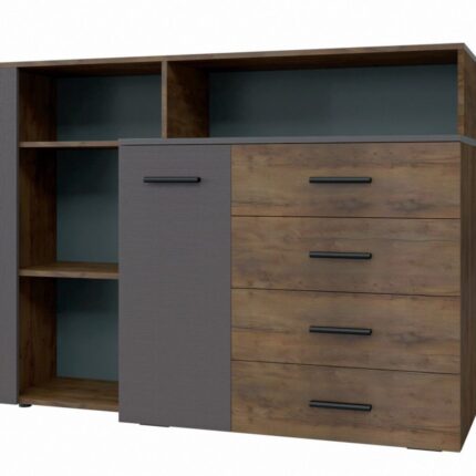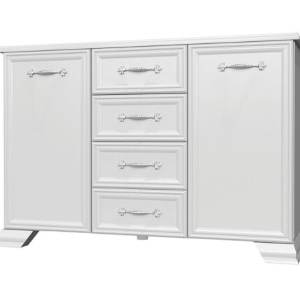 В комоде два отделения: левое отделение оснащено полкой и дверкой, правое отделение оснащено 4мя выдвижными ящиками.