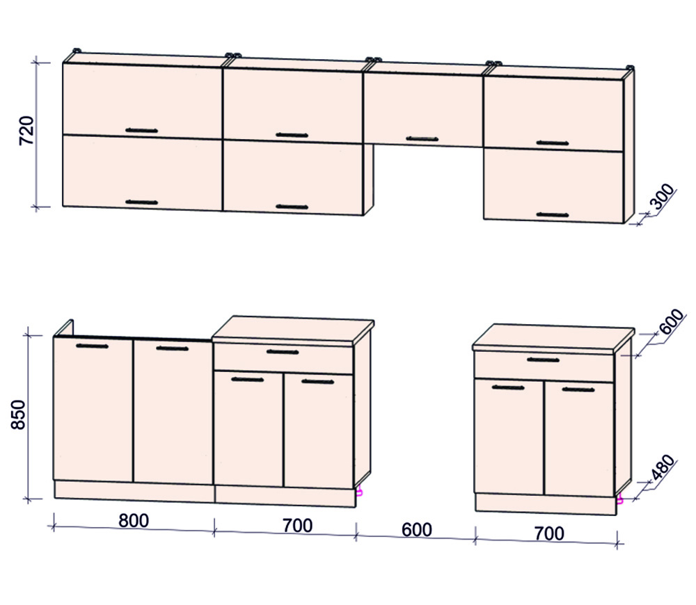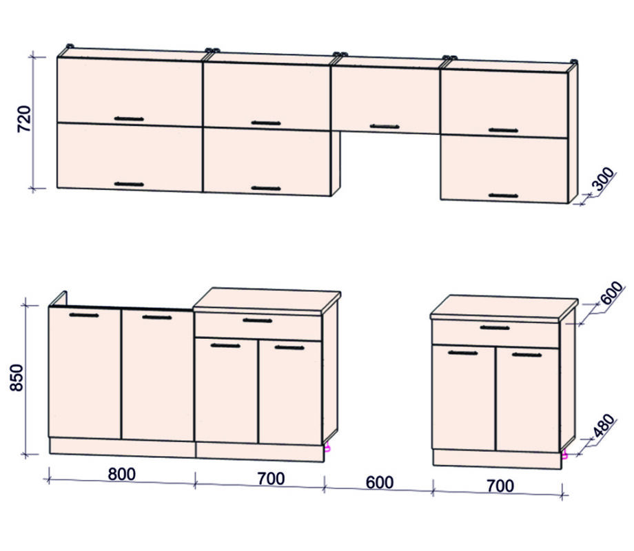 - Высота верхних шкафов: 720 мм
