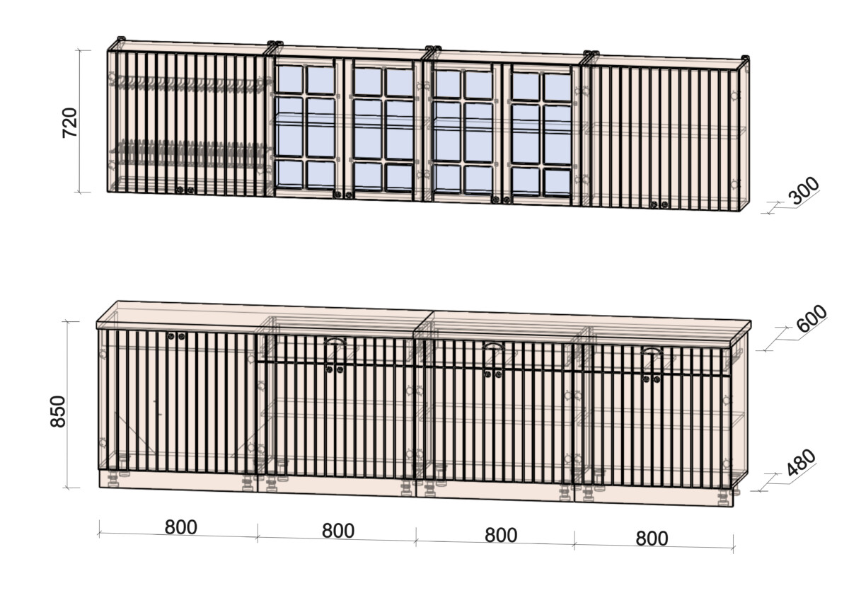 - Высота верхних шкафов: 720 мм