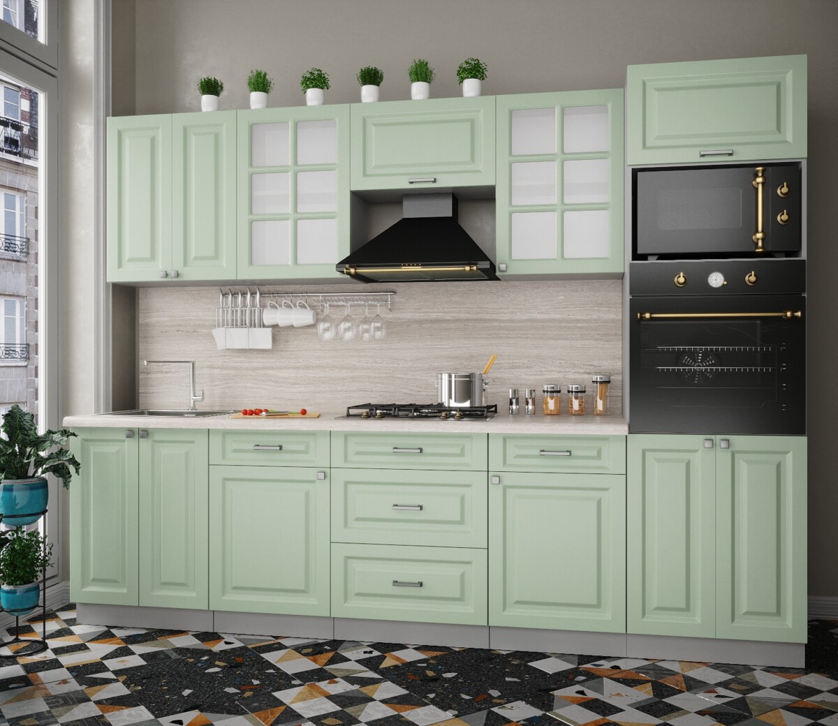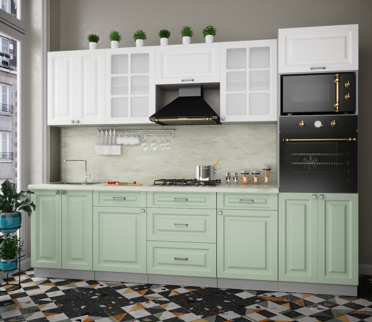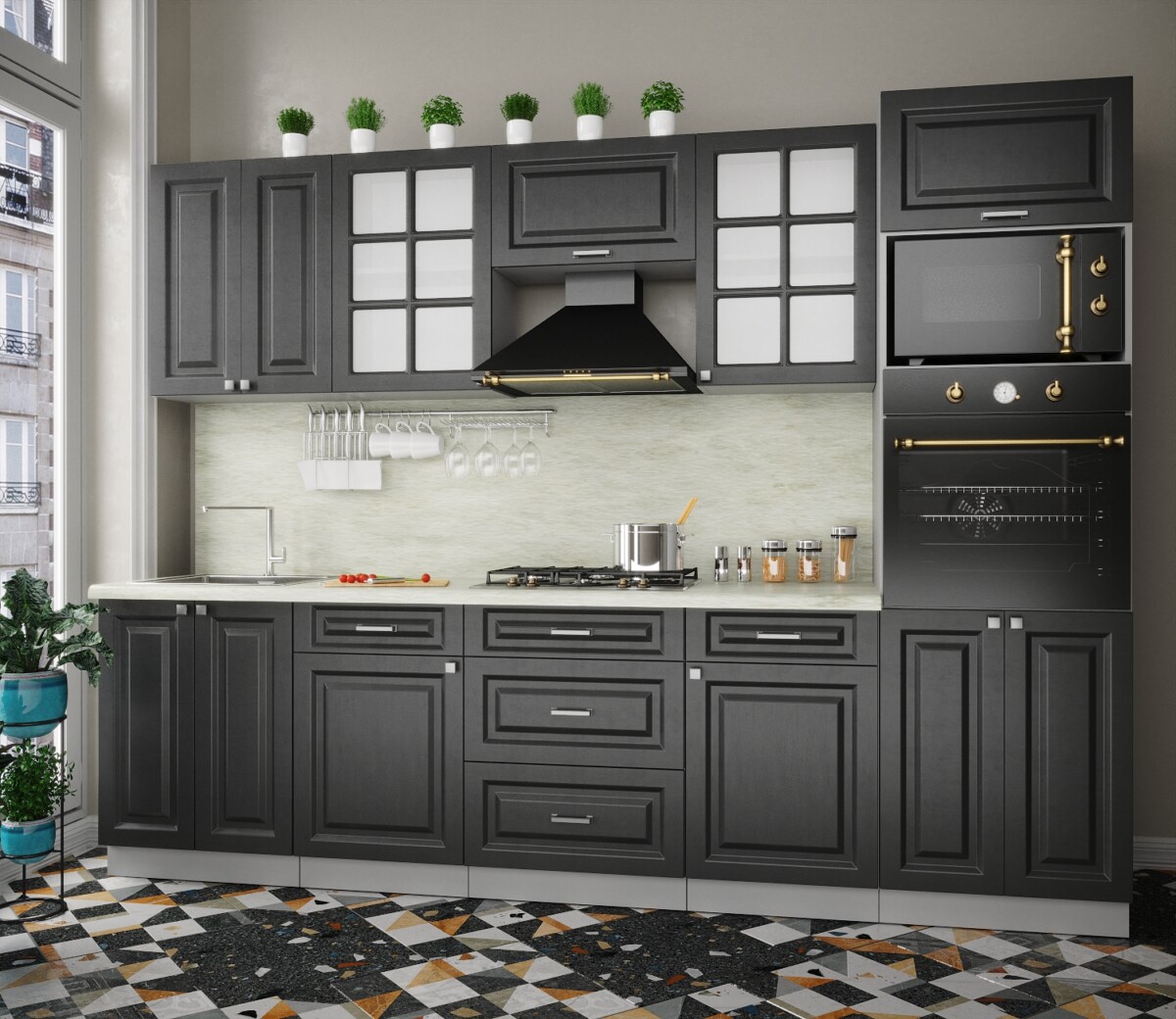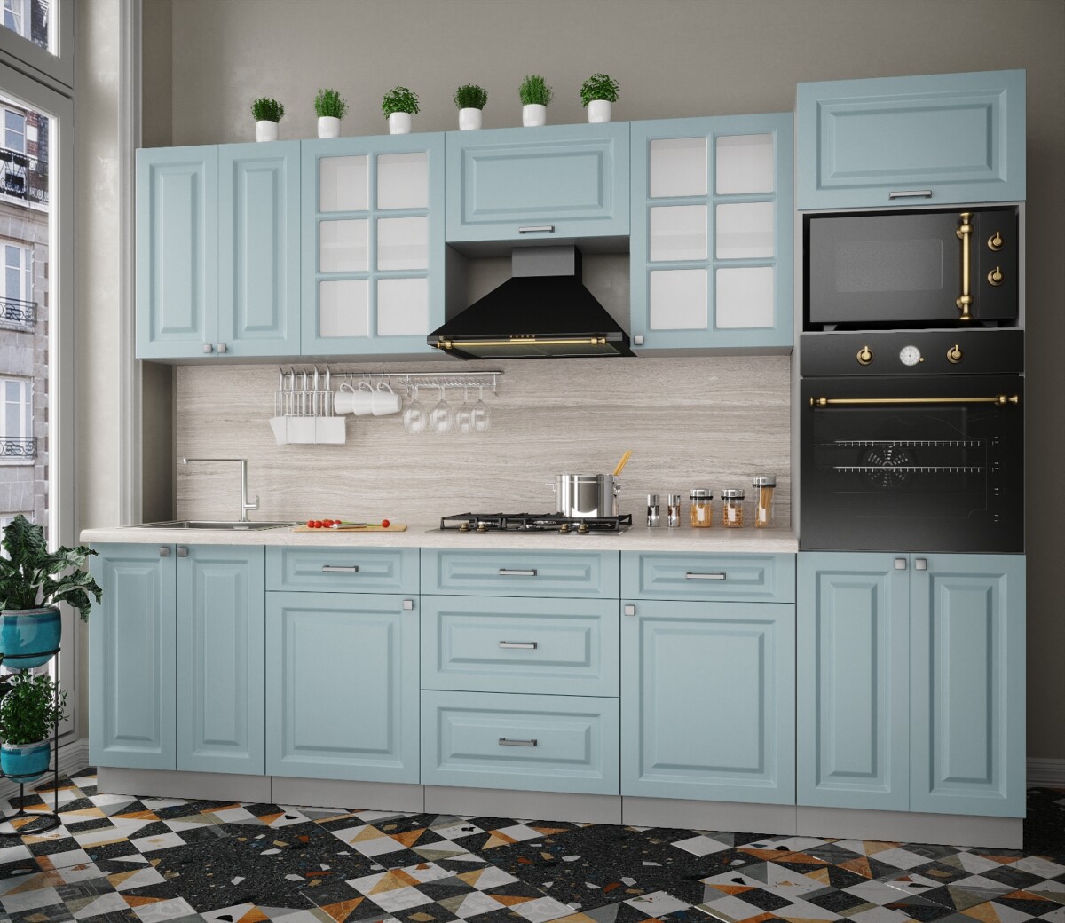 Особенность фасадов кухни: фасад с витриной, фрезеровка «шпрос».