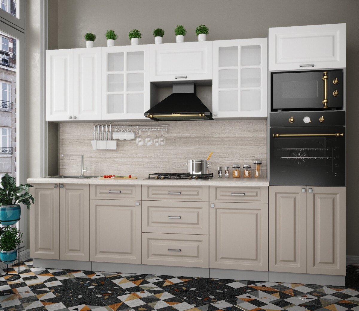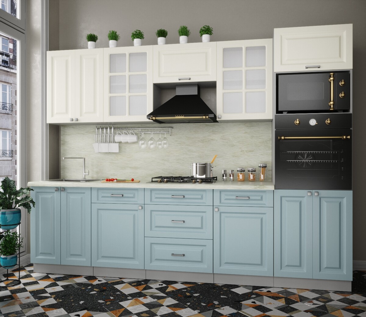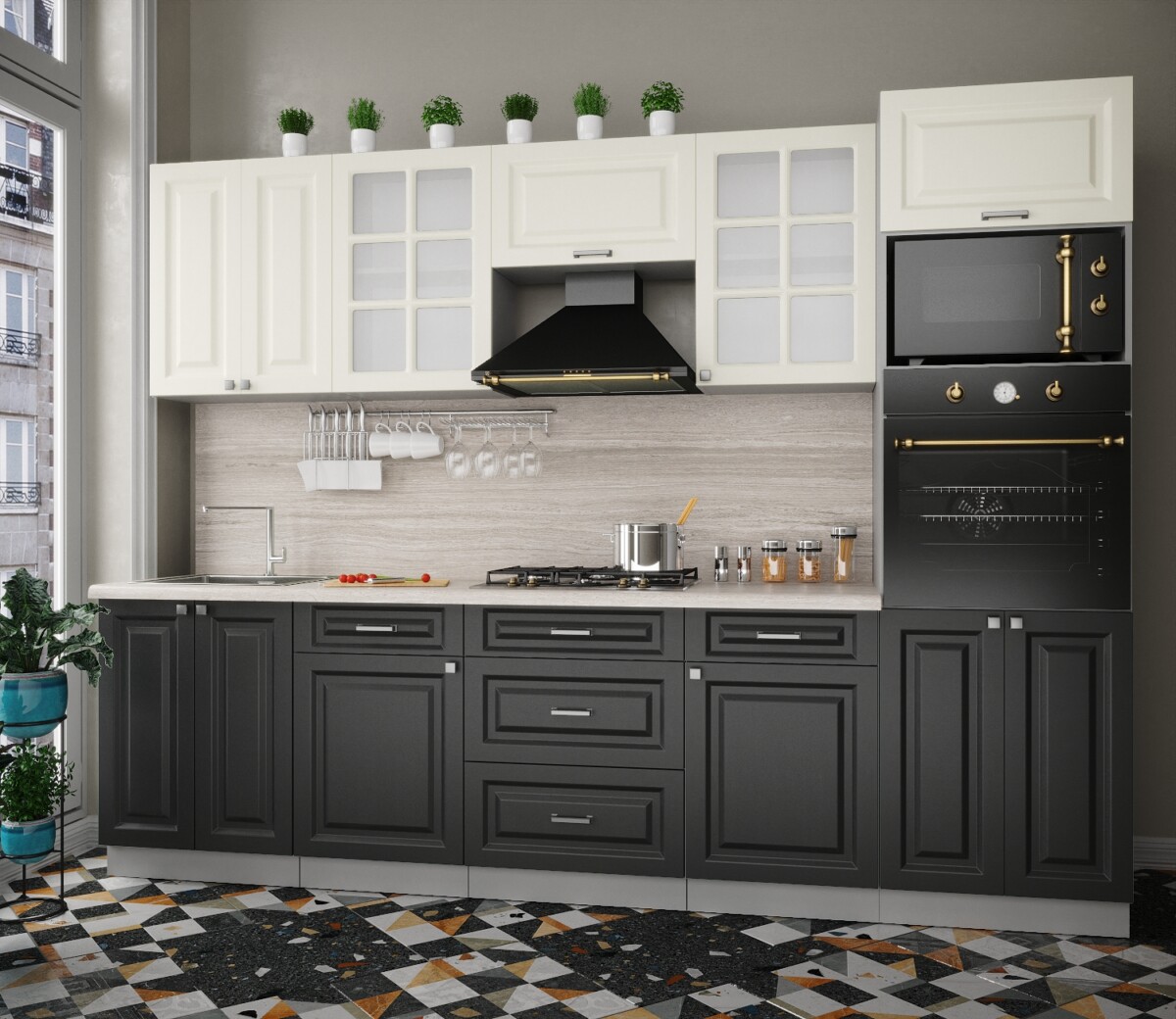 Особенность фасадов кухни: фасад с витриной, фрезеровка «шпрос».
