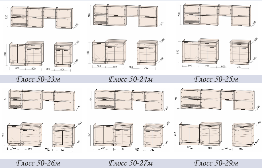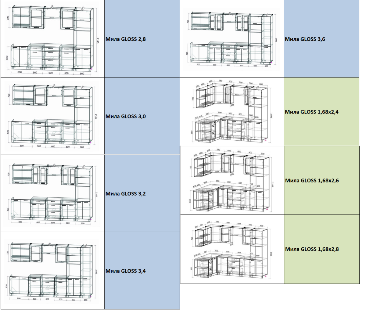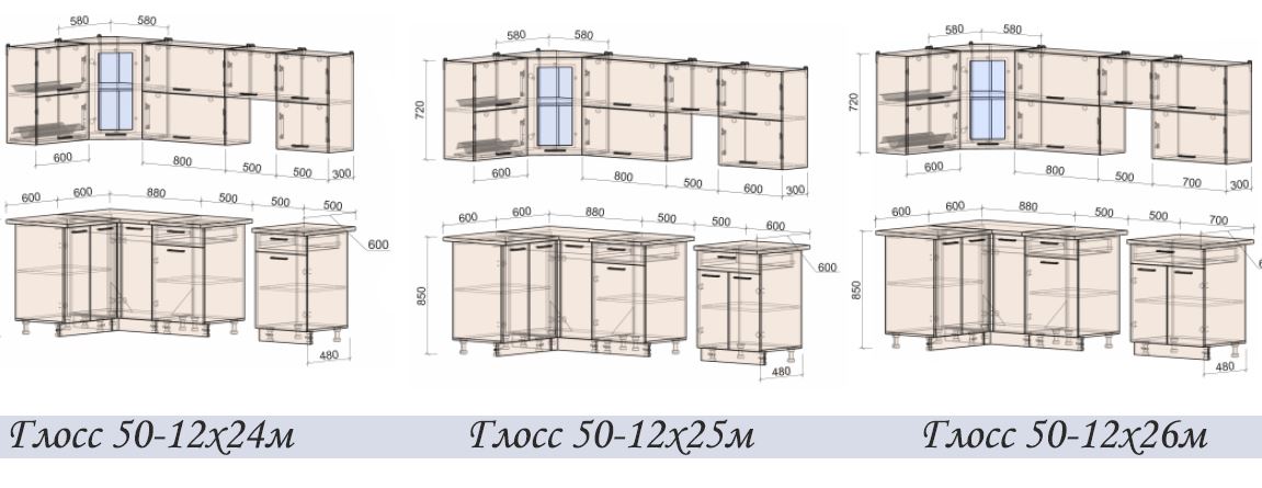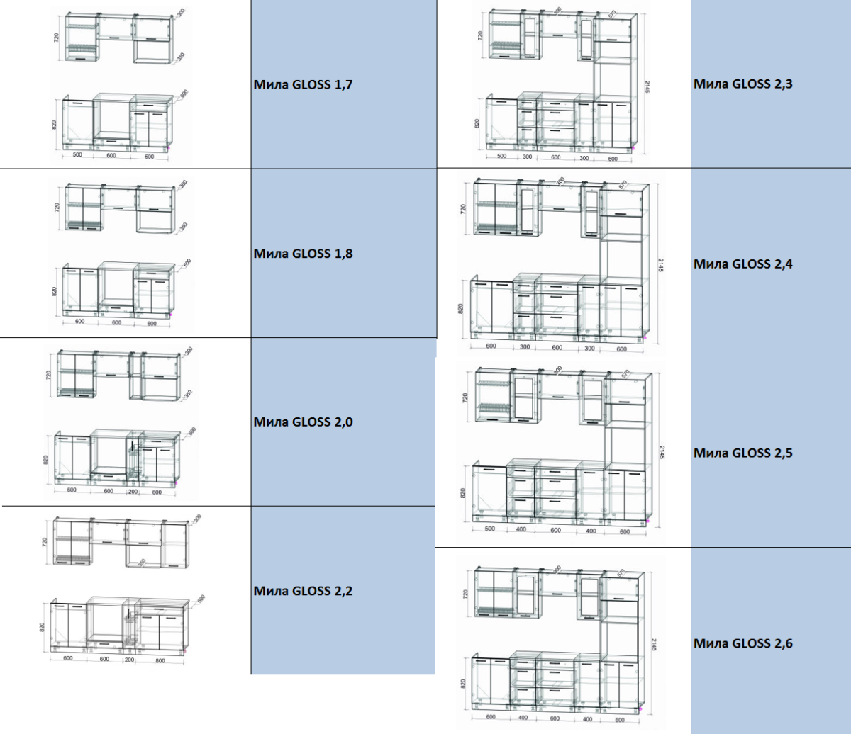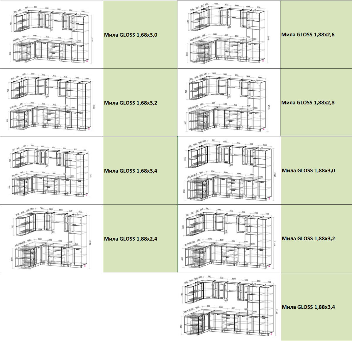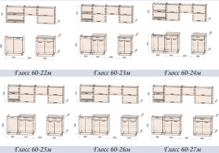 Кухня модульная. Все шкафы отдельностоящие, их можно менять между собой местами. Дополнительно можно приобрести шкафы под вытяжку (500мм или 600мм), встраиваемую духовку или варочную панель, пенал кухонный а так же любой другой шкаф из серии Мила Глосс. Кроме того, комплекты можно полностью собрать модульно, только из тех элементов, которые вам подходят.