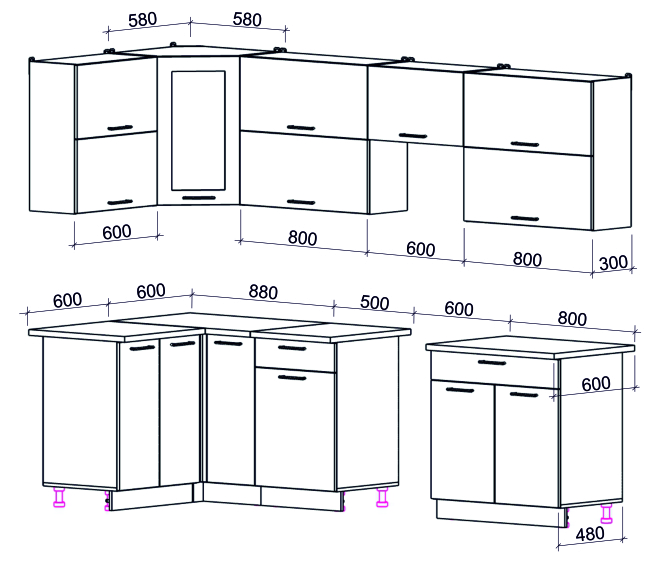 Кухня модульная. Все шкафы отдельностоящие, их можно менять между собой местами. Дополнительно можно приобрести шкафы под вытяжку (500мм или 600мм), встраиваемую духовку или варочную панель, пенал кухонный а так же любой другой шкаф из серии Мила Глосс. Кроме того, комплекты можно полностью собрать модульно, только из тех элементов, которые вам подходят.