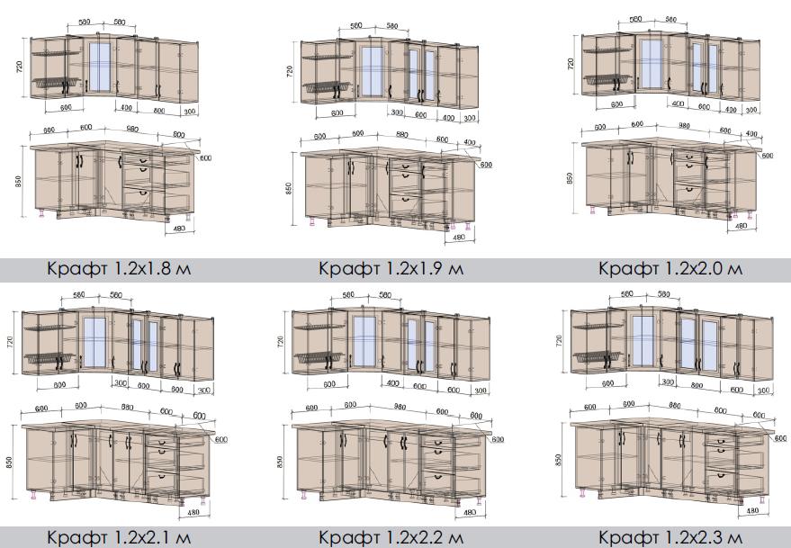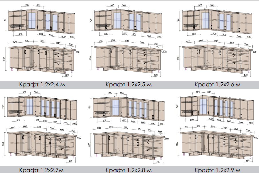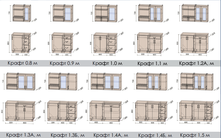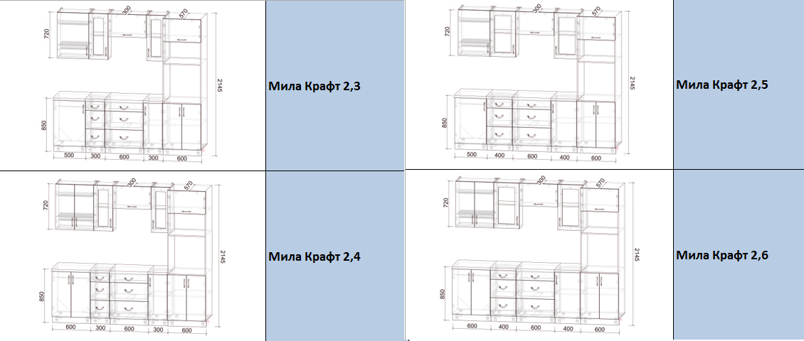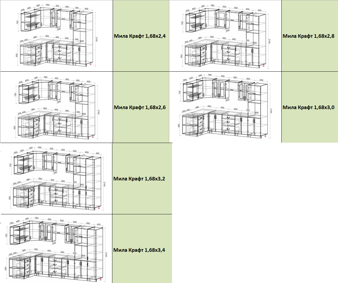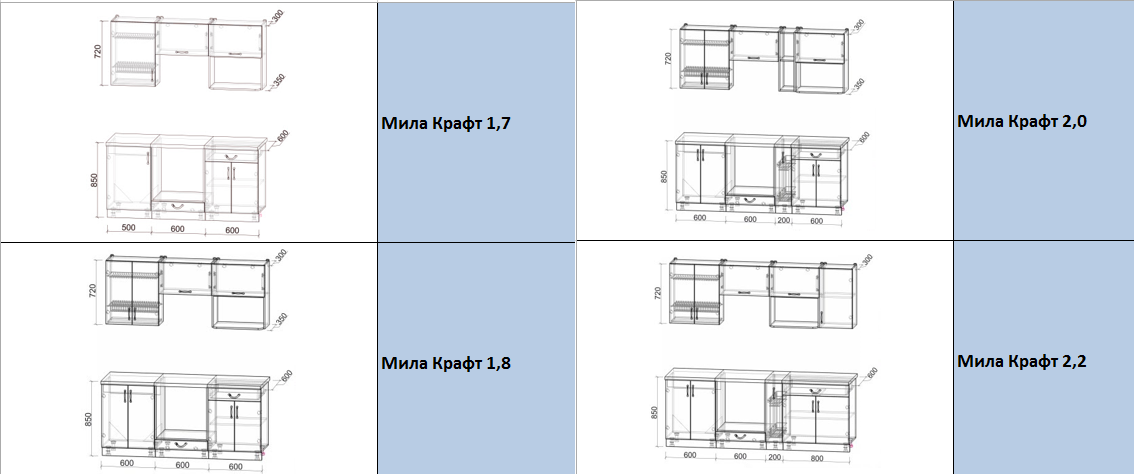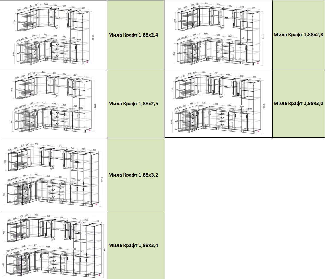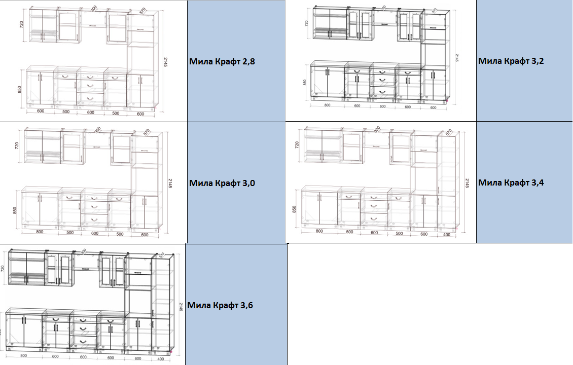 Кухня модульная. Все шкафы отдельностоящие, их можно менять между собой местами. Дополнительно можно приобрести шкафы под вытяжку (500мм или 600мм), встраиваемую духовку или варочную панель, пенал кухонный а так же любой другой шкаф из серии Мила Крафт. Кроме того, комплекты можно полностью собрать модульно, только из тех элементов, которые вам подходят.