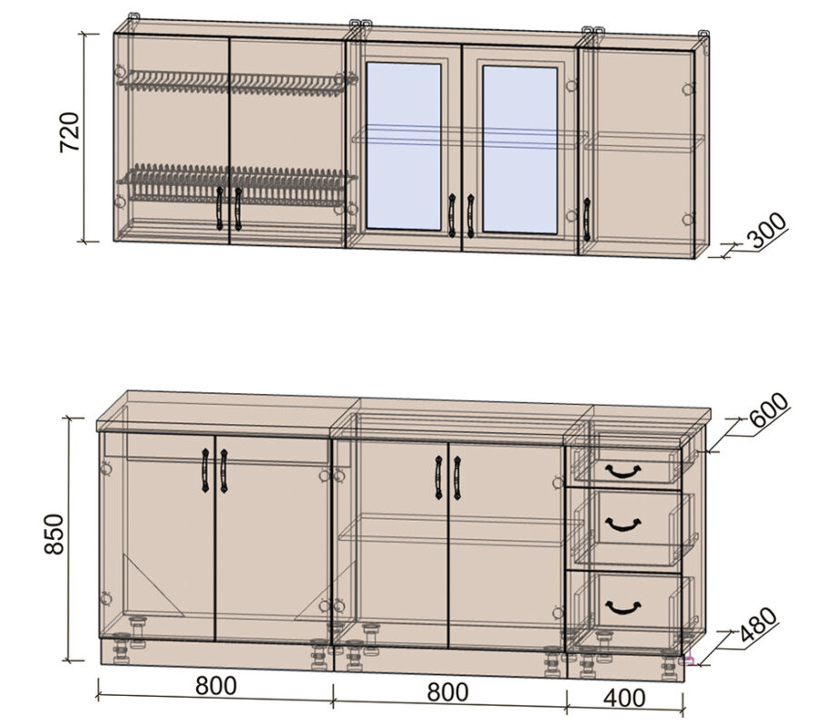 Кухня модульная. Все шкафы отдельностоящие, их можно менять между собой местами. Дополнительно можно приобрести шкафы под вытяжку (500мм или 600мм), встраиваемую духовку или варочную панель, пенал кухонный а так же любой другой шкаф из серии Мила Крафт. Кроме того, комплекты можно полностью собрать модульно, только из тех элементов, которые вам подходят.