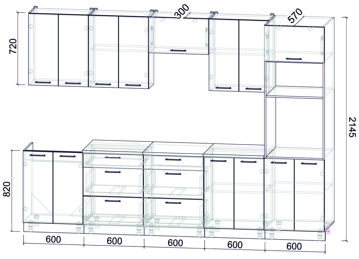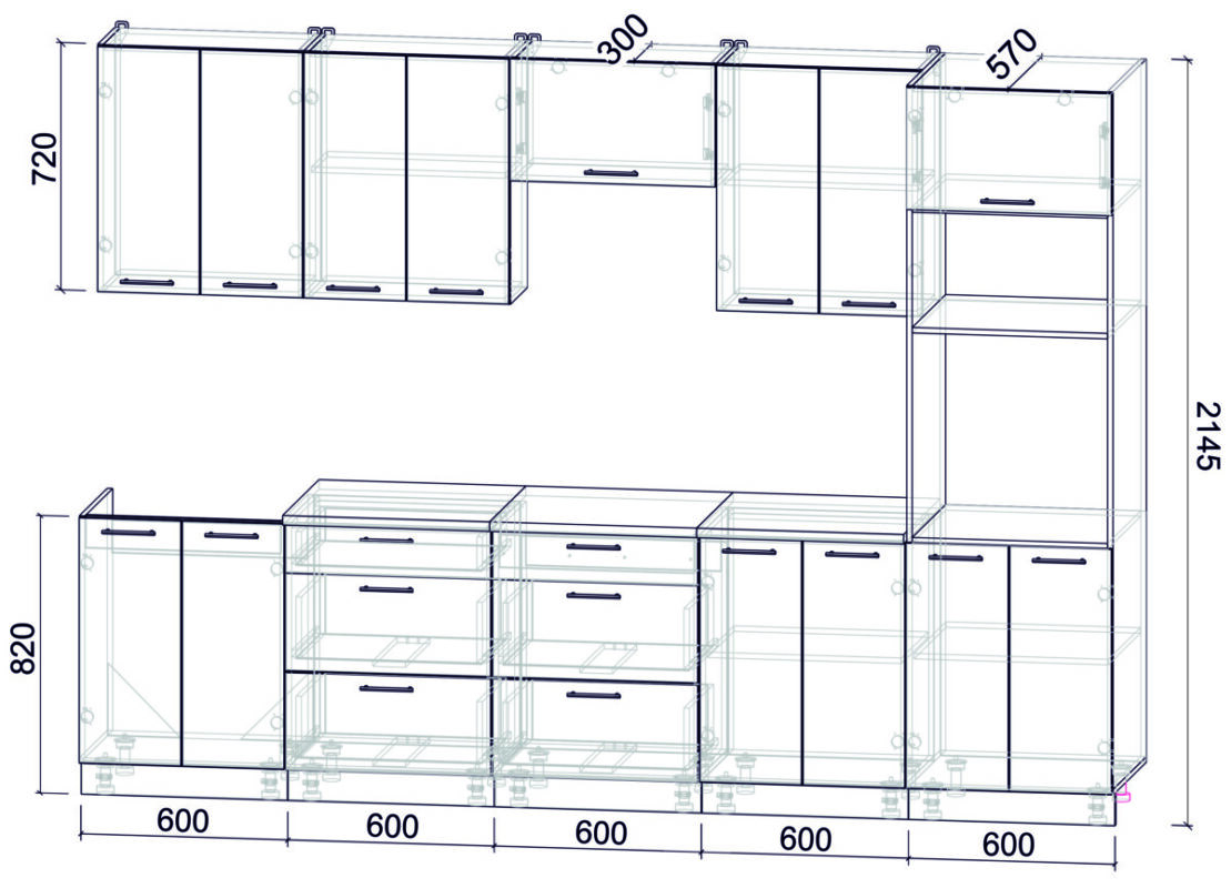 - Высота верхних шкафов: 720 мм