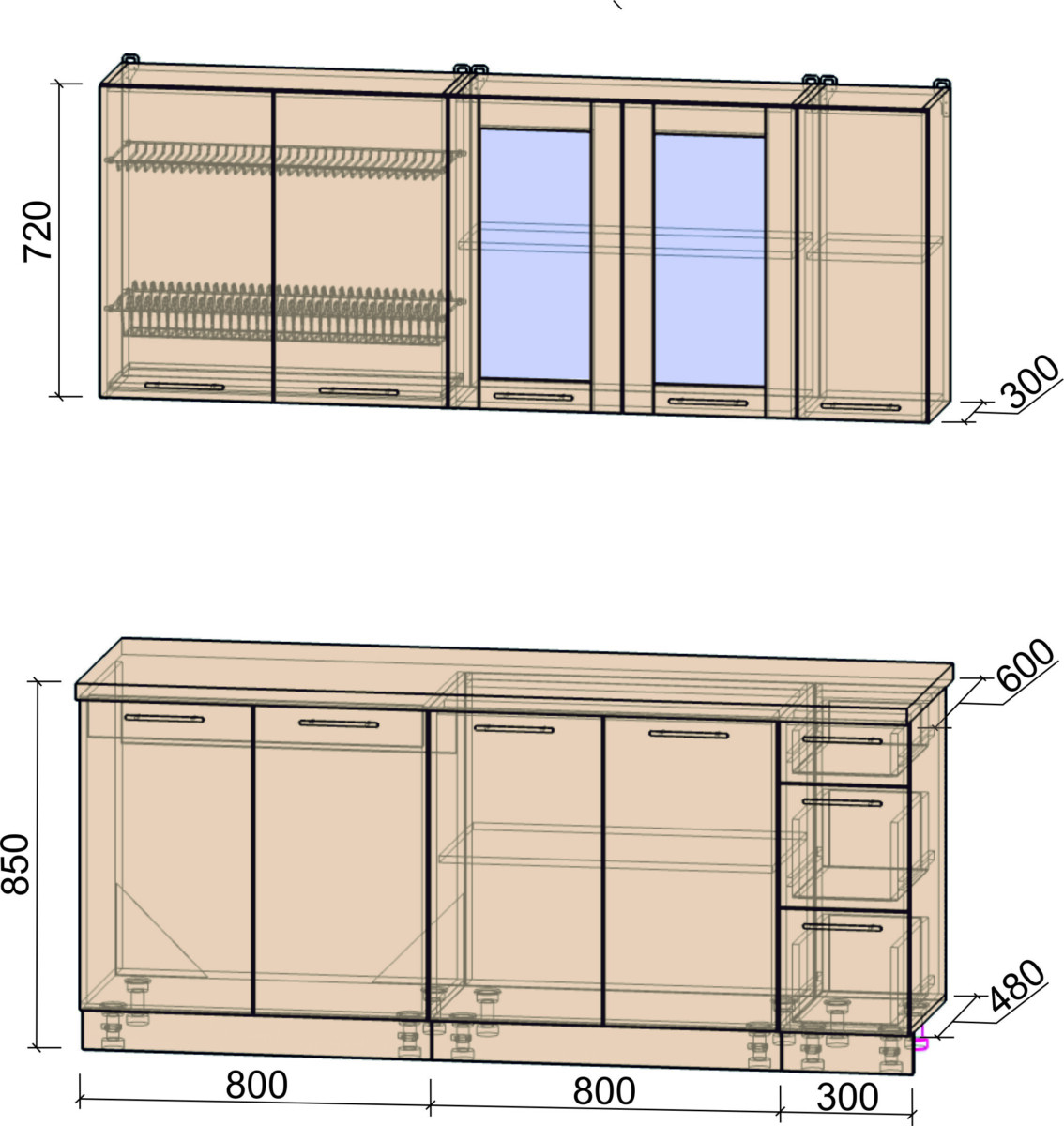 Кухня модульная. Все шкафы отдельностоящие, их можно менять между собой местами. Дополнительно можно приобрести шкафы под вытяжку (500мм или 600мм), встраиваемую духовку или варочную панель, пенал кухонный а так же любой другой шкаф из серии Мила Пластик. Кроме того, комплекты можно полностью собрать модульно, только из тех элементов, которые вам подходят.