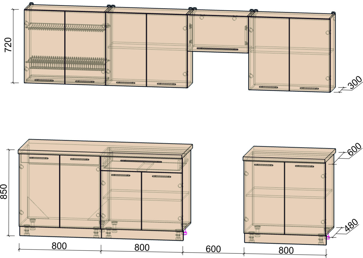Кухня модульная. Все шкафы отдельностоящие, их можно менять между собой местами. Дополнительно можно приобрести шкафы под вытяжку (500мм или 600мм), встраиваемую духовку или варочную панель, пенал кухонный а так же любой другой шкаф из серии Мила Пластик. Кроме того, комплекты можно полностью собрать модульно, только из тех элементов, которые вам подходят.