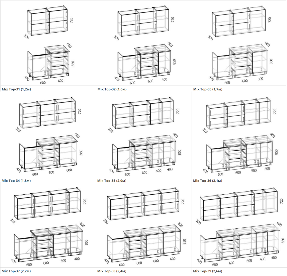 - Глубина верхних шкафов 320 мм
