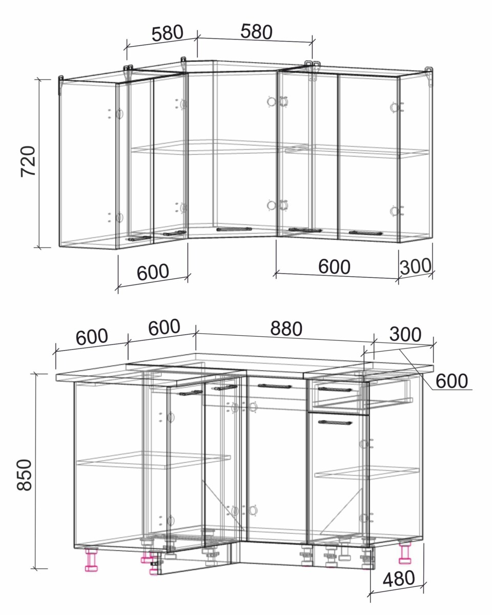 Кухня модульная. Все шкафы отдельностоящие, их можно менять между собой местами. Дополнительно можно приобрести шкафы под вытяжку (500мм или 600мм) и встраиваемую духовку.