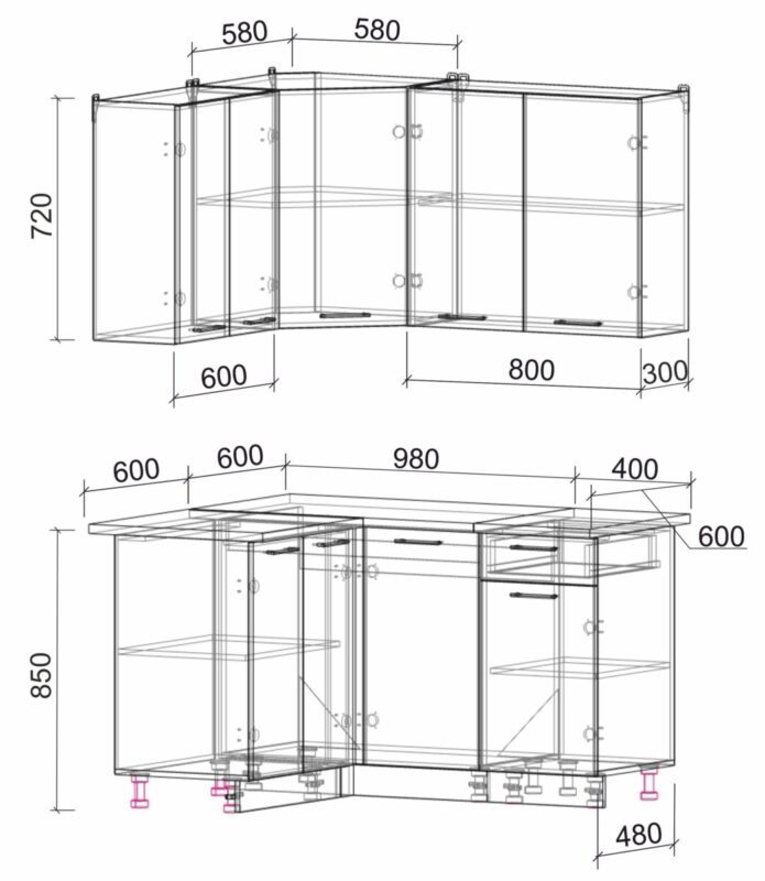 Кухня модульная. Все шкафы отдельностоящие, их можно менять между собой местами. Дополнительно можно приобрести шкафы под вытяжку (500мм или 600мм) и встраиваемую духовку.